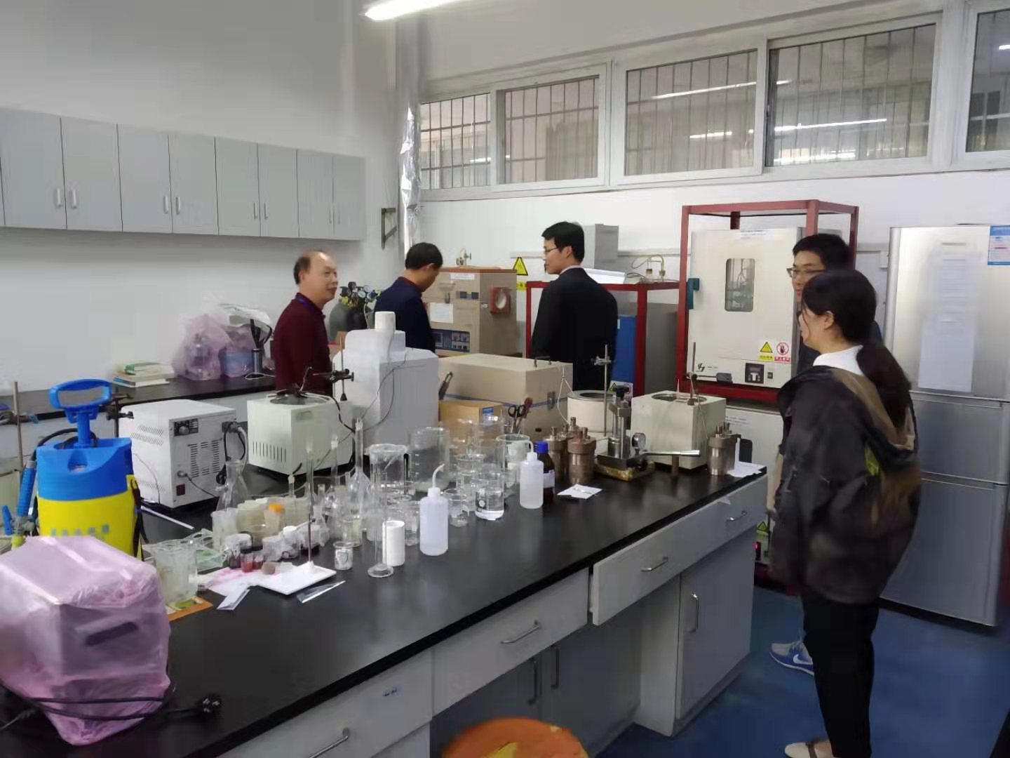 本次安全检查重点检查了科研实验室的危险化学品使用管理、安全卫生值日管理、废弃物管理、高温高压等仪器设备使用管理、消防设施及安全通道等。
